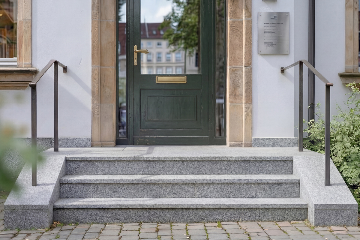 Gleichzeitig gewinnt die Außenwirkung: Modernisierte Eingänge und Treppen stärken den ersten Eindruck, verbessern Exposés und unterstützen erfolgreiche Besichtigungen. In Wohnanlagen sorgt eine einheitliche Gestaltung für ein professionelles Gesamtbild und eine stärkere Wahrnehmung Ihrer Wohnungsbaugesellschaft. Mit Vorab-Visualisierungen (Fotos/Renderings) schaffen Sie Freigabesicherheit ohne Überraschungen. Das Ergebnis: hochwertiger, rutschhemmender Naturstein, der Optik und Sicherheit gleichermaßen verbessert.